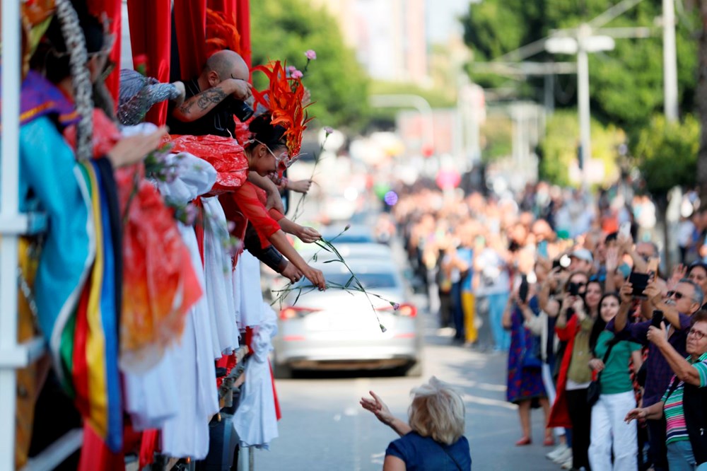Büyükşehir Belediyesi'nin bando ekibi ve çeşitli dans gösteri gruplarından oluşan ekiplerin de eşlik ettiği kortejde, sanatçılar halka çiçekler attı.