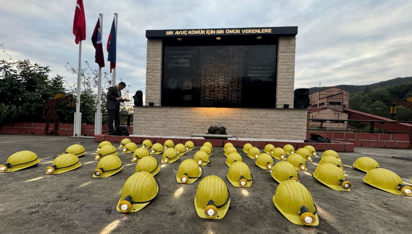 Törende, patlamada hayatını kaybeden işçilerin isimlerinin yazılı olduğu madenci anıtı önüne baretler ile karanfil bırakıldı.