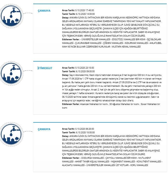Kesikköprü hattındaki arıza sonucu Ankara'ya sağlanan su miktarının yarıya düştüğü belirtilerek, bu nedenle kent genelinde 29 Eylül tarihinden itibaren dönüşümlü su kesintilerinin sürdüğü ifade edildi.