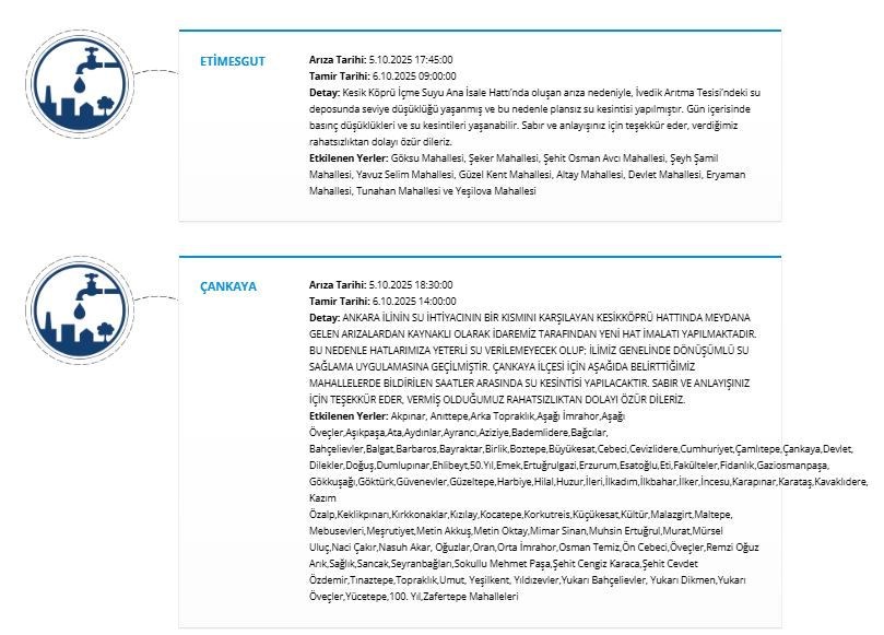 Ankara Su ve Kanalizasyon İdaresi Genel Müdürlüğü (ASKİ), Çankaya, Elmadağ, Yenimahalle, Gölbaşı, Mamak ve Altındağ ilçelerinin bazı mahallelerinde su kesintisi uygulanacağına dair açıklama yaptı. ASKİ, Kesikköprü İçme Suyu Ana İsale Hattı'nda meydana gelen arızalar nedeniyle dönüşümlü su kesintileri uygulandığını belirtti.
