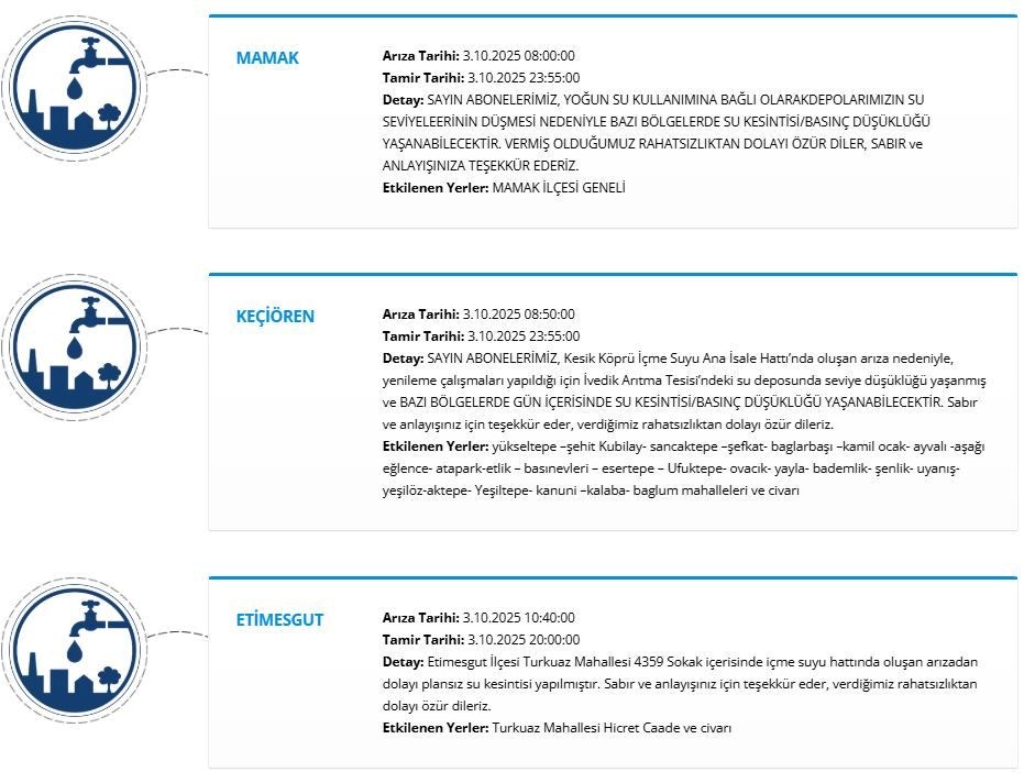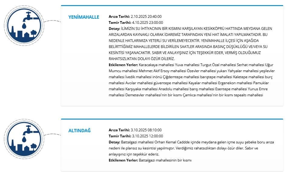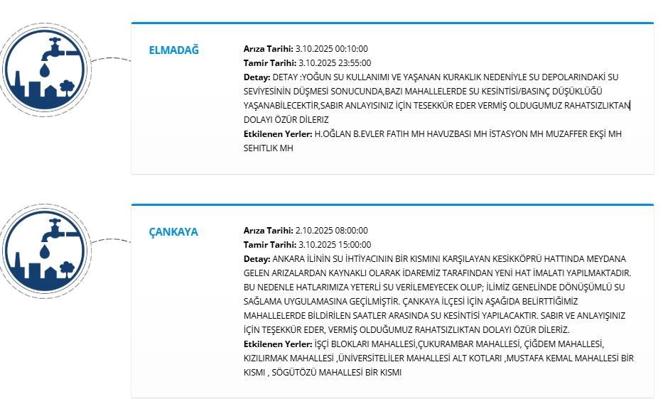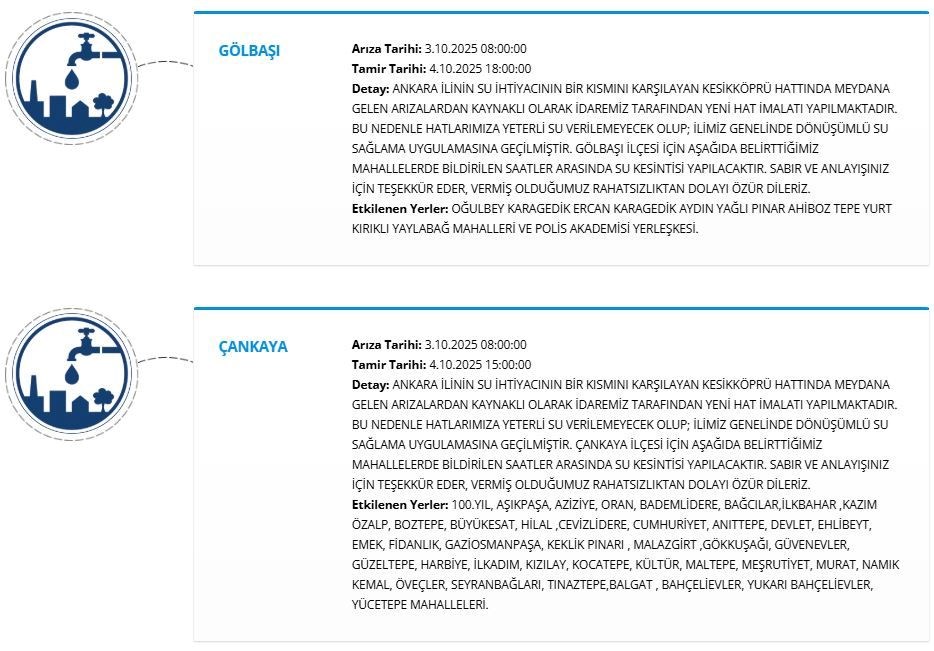 ASKİ, Kesikköprü İçme Suyu Ana İsale Hattı'ndaki arıza nedeniyle Çankaya ve Gölbaşı ilçelerindeki bazı mahallelerde bugün saat 08.00'den itibaren 4 Ekim saat 08.00'e kadar su kesintisi yapılacağını açıkladı.