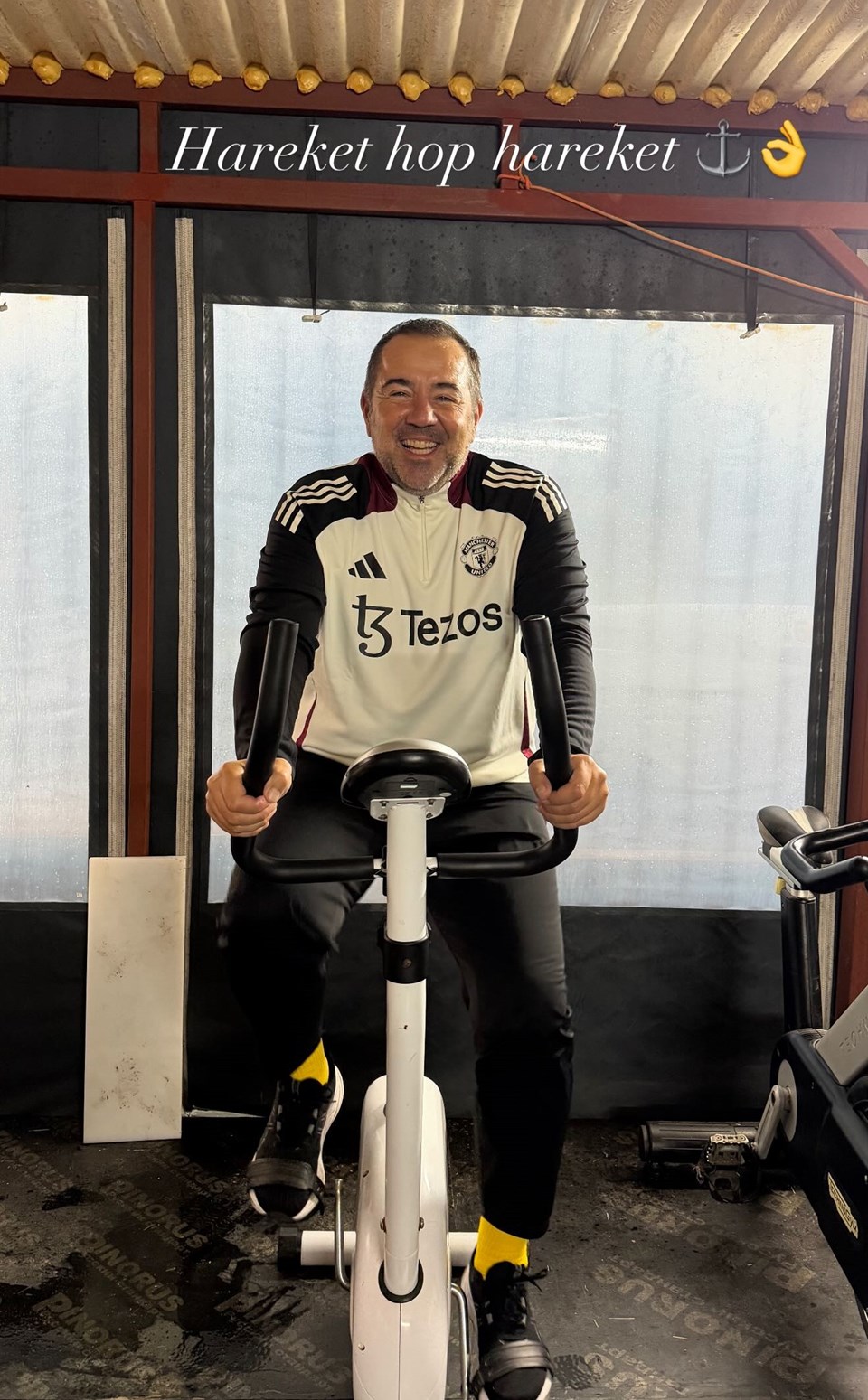 Spor salonunda öncelikle kondisyon bisikletinde fotoğraflar çeken ünlü komedyen, "Hareket hop hareket" şeklinde bir mesaj verdi.