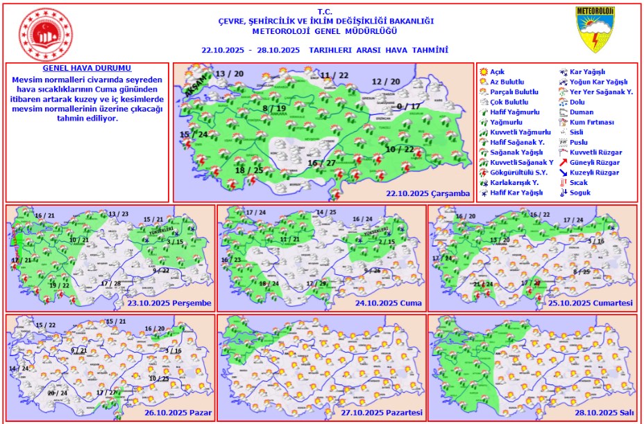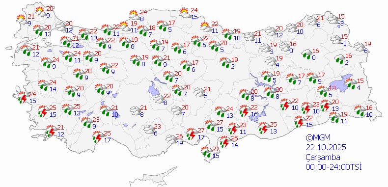 Meteoroloji Genel Müdürlüğü tarafından yapılan değerlendirmenin sonuçlarına göre, ülke genelinde hava durumu parçalı ve yer yer çok bulutlu olacak. Marmara'nın güney ve doğusu, Ege, Akdeniz (Mersin hariç), İç Anadolu'nun kuzey kesimleri ile Batı ve Orta Karadeniz'in iç bölgeleri, Doğu Anadolu'nun bazı illeri (Erzincan, Kars, Ardahan ve Iğdır hariç), Güneydoğu Anadolu, Tekirdağ ve Ordu çevrelerinde sağanak ve gök gürültülü sağanak yağış bekleniyor.