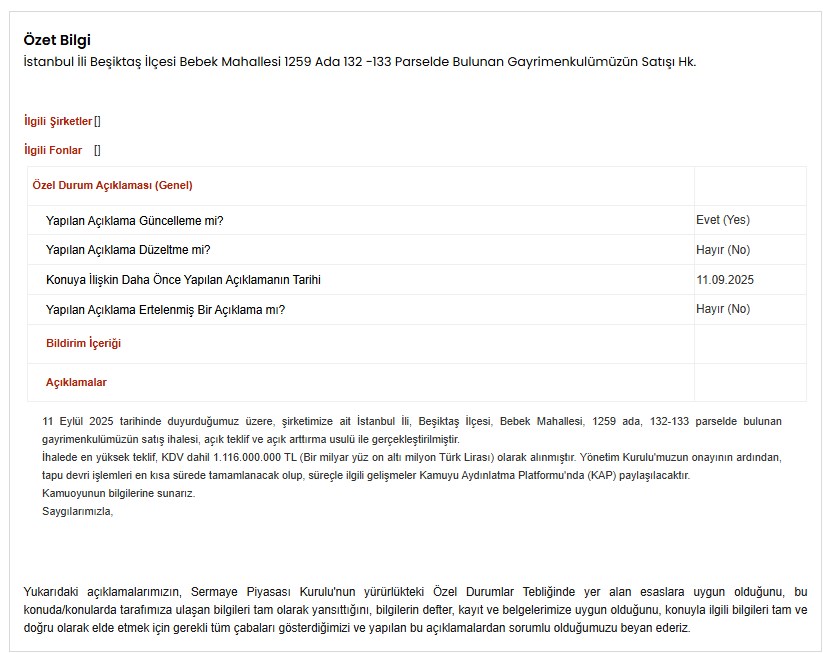 "11 Eylül 2025'te açıkladığımız üzere, şirketimize ait İstanbul İli, Beşiktaş İlçesi, Bebek Mahallesi, 1259 ada, 132-133 parselde bulunan gayrimenkulümüzün satış ihalesi, açık teklif ve açık arttırma usulü ile gerçekleştirilmiştir. İhalede en yüksek teklif, KDV dahil 1.116.000.000 TL (Bir milyar yüz on altı milyon Türk Lirası) olarak alınmıştır. Yönetim Kurulumuzun onayının ardından, tapu devri işlemleri en kısa sürede tamamlanacak olup, süreçle ilgili gelişmeler Kamuyu Aydınlatma Platformu'nda (KAP) paylaşılacaktır."