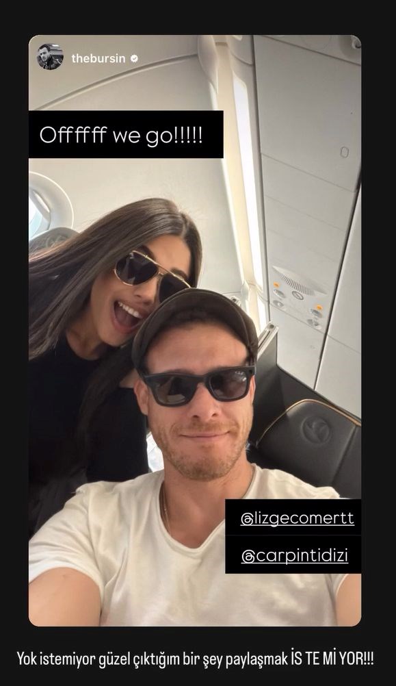 Kerem Bürsin, partneri Lizge Cömert ile birlikte uçaktaki fotoğrafını "Biz gidiyoruz" notuyla paylaştı.