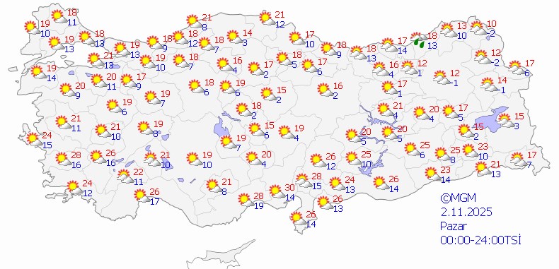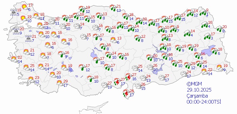 Meteoroloji Genel Müdürlüğü tarafından yapılan hava tahminleri, ülke genelinin parçalı ve çok bulutlu olacağını, İç Anadolu'nun güney ve doğusu, Karadeniz, Doğu Anadolu (Hakkari hariç) ile Afyon'un güneyi, Adana'nın kuzey ve doğusu, Osmaniye, Hatay, Kahramanmaraş, Isparta, Diyarbakır, Batman ve Siirt çevrelerinin yağmur ve sağanak yağışlı, yer yer gök gürültülü sağanak yağışlı geçeceğini gösteriyor. Doğu Karadeniz’in iç kesimlerinin yüksek yerleri ile Doğu Anadolu’nun kuzeydoğusunun yüksek kesimlerinde karla karışık yağmur ve zaman zaman kar yağışı bekleniyor.