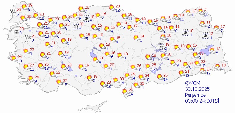 Yağışların, Doğu Karadeniz, Doğu Anadolu'nun kuzeyi (Iğdır hariç) ile İskenderun körfezi, Ordu, Tokat ve Sivas çevrelerinde yer yer güçlü olabileceği öngörülüyor. Bu sabah ve gece saatlerinde Marmara, İç Ege, İç Anadolu'nun kuzeybatısı, Karadeniz'in iç kesimleri ile Doğu Anadolu'nun doğusunda pus ve yer yer sis olaylarının etkili olacağı tahmin ediliyor.