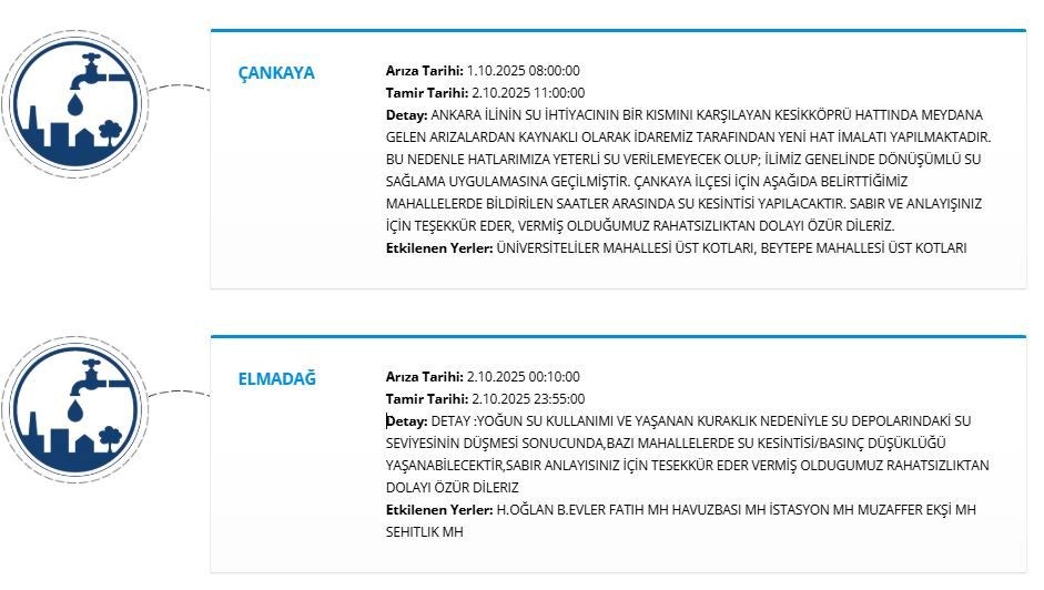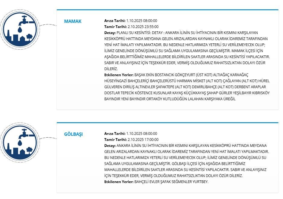Ankara Su ve Kanalizasyon İdaresi Genel Müdürlüğü (ASKİ), Mamak, Gölbaşı, Çankaya, Elmadağ, Polatlı, Etimesgut, Keçiören ve Yenimahalle ilçelerinde uzun süreli su kesintileri yaşanacağına dair açıklamada bulundu. Kesikköprü İçme Suyu Ana İsale Hattı'ndaki arızadan dolayı meydana gelecek kesintilerden etkilenecek mahalleler ve kesintilerin süresi, ASKİ'nin resmi internet sitesinden duyurulacak.