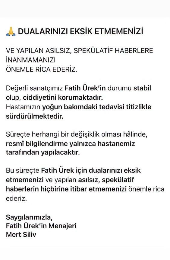 Yoğun bakımda tedavi edilen ve hala uyutulan Fatih Ürek'in menajeri Mert Siliv, konuyla ilgili yazılı bir açıklama yaptı.