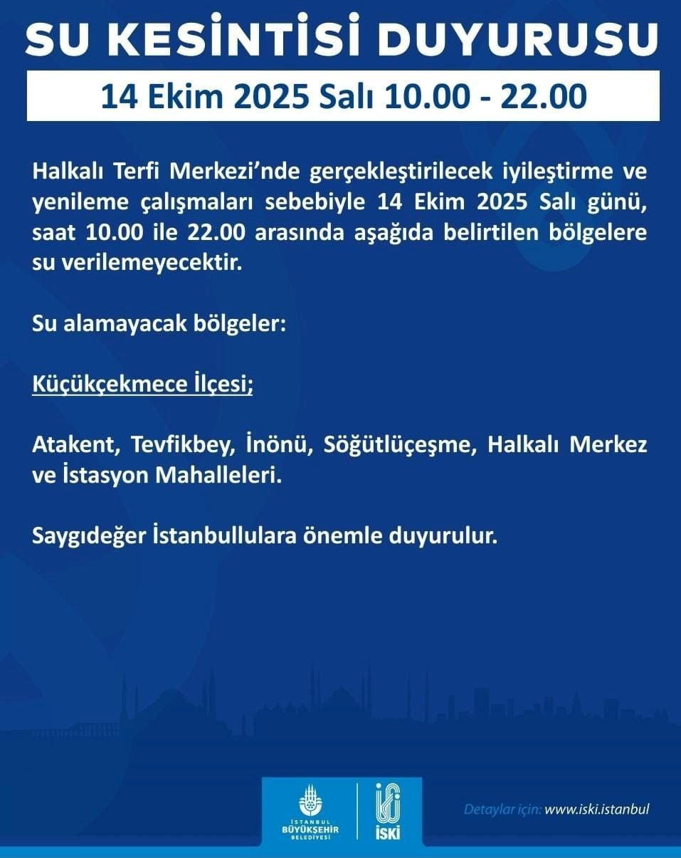 İSKİ'nin resmi sosyal medya hesabı aracılığıyla yapılan açıklamada, "Halkalı Terfi Merkezi'nde yapılacak olan iyileştirme ve yenileme çalışmalar nedeniyle 14 Ekim 2025 Salı günü, saat 10.00 ile 22.00 arasında aşağıda listelenen bölgelere su verilemeyecektir. Su alamayacak bölgeler: Küçükçekmece Atakent, Tevfikbey, İnönü, Söğütlüçeşme, Halkalı Merkez ve İstasyon Mahalleleri" bilgilendirmesi yapıldı.