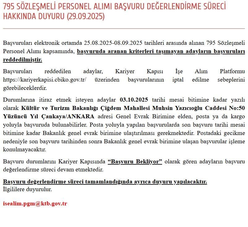 795 Sözleşmeli Personel Alımı Başvuru Değerlendirme Süreci Hakkında Duyuru