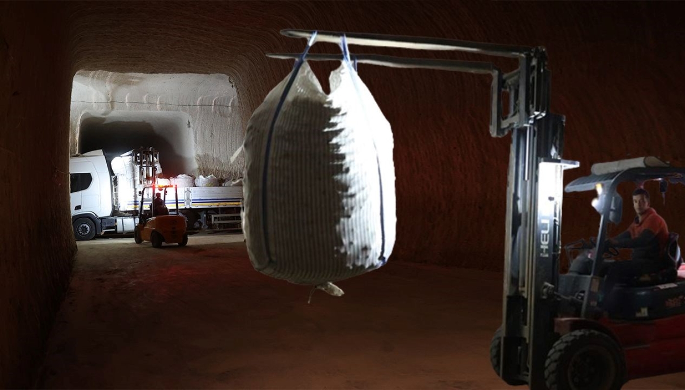 Bölgedeki 1.326 ruhsatlı yer altı deposuna, tırlarla getirilen patatesler, iş makineleri yardımıyla bir tonluk çuvallar içerisinde kayadan oyma mahzenlere yerleştiriliyor.