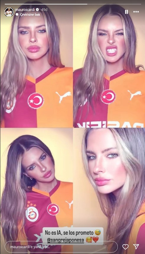 İcardi, sevgilisi China Suarez'in Galatasaray forması giydiği bir fotoğrafını paylaşarak "Yapay zeka değil, yemin ederim." şeklinde bir not düştü.