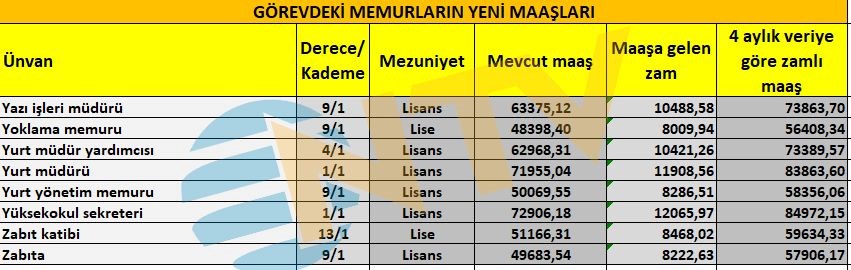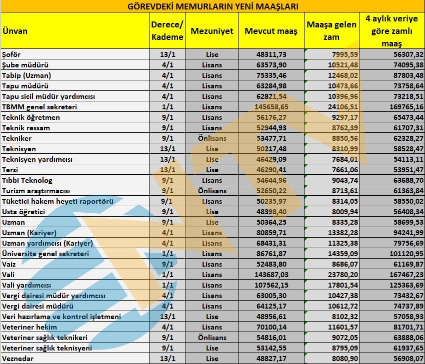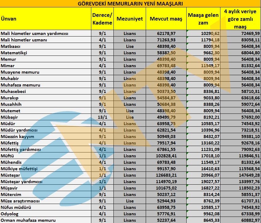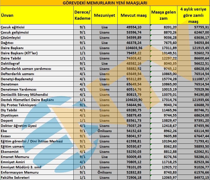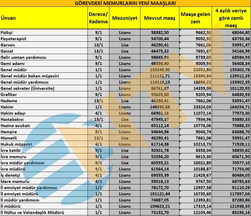 Yüzde 16,55'lik zam oranına göre polis, öğretmen, hemşire, profesör, memur, başkomiser, vaiz, avukat, araştırma görevlisi ve mühendis gibi çeşitli unvanlara sahip kişilerin alacakları zamlar da netleşmiş durumda.