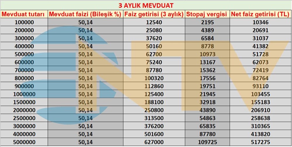 1 milyon lirasını 32 gün vadeli mevduata yatıran bir tasarruf sahibi, yüzde 47.72 oranında yıllık bileşik faizle brüt 39 bin 766 lira kazanç sağlamakta. Yüzde 17.5 stopaj vergisi düştükten sonra net faiz getirisi 32 bin 807 lira olmaktadır.