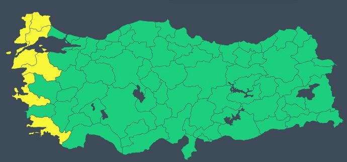 Trakya ve Kıyı Ege'de yer alan yedi şehir için sarı kodlu uyarı yapıldı. Bu şehirler arasında Balıkesir, Çanakkale, Edirne, İzmir, Kırklareli, Muğla ve Tekirdağ bulunuyor. Vatandaşların ani sel, su baskını, yıldırım, yağış sırasında şiddetli rüzgar ve ulaşım aksamaları gibi tehlikeler karşısında dikkatli ve tedbirli olmaları gerektiği ifade edildi.