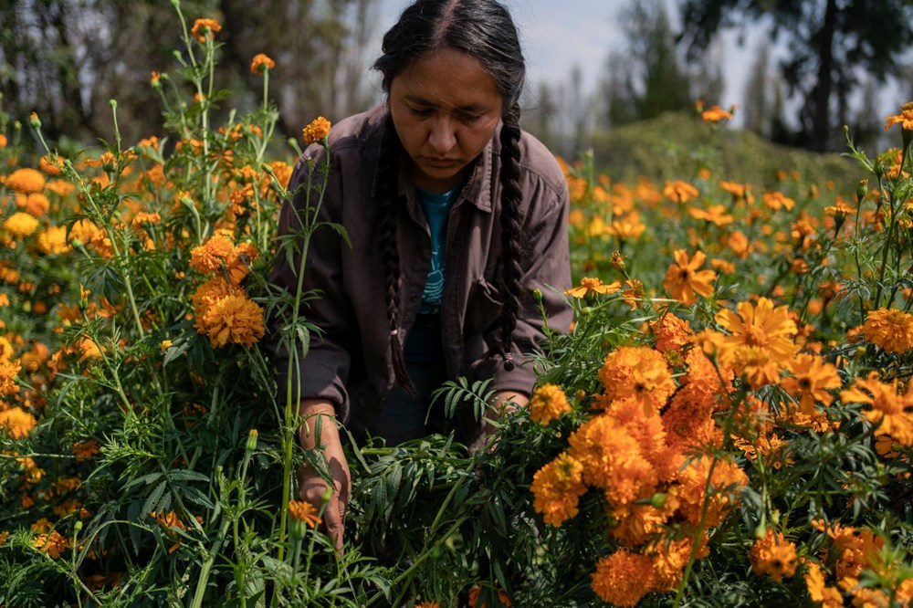 Başkent Meksiko'nun güney kırsalındaki Xochimilco'da, 50 yaşındaki çiftçi Lucia Ortiz, yerel halk arasında "ölülerin çiçeği" olarak bilinen kadife çiçeği tarlalarında dolaşıyor.