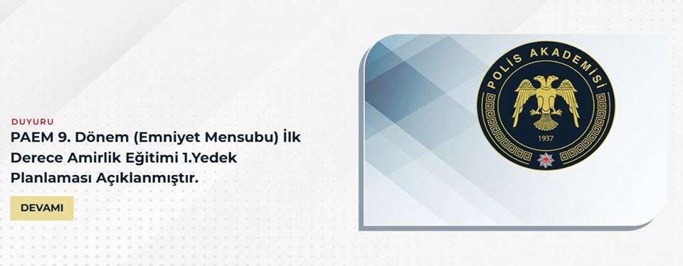 2025-2026 Eğitim-Öğretim Dönemi PAEM (Emniyet Mensubu) 9. Dönem İlk Derece Amirlik İntibak Eğitimi, 29 Eylül 2025 tarihi itibarıyla başladı. Polis Amirleri Eğitimi Merkezi Müdürlüğü Giriş ve Eğitim Öğretim Yönetmeliği'nin 21. maddesinin 2. fıkrası gereğince, 9. Dönem İlk Derece Amirlik İntibak Eğitimine katılmayan ve eğitimden feragat eden iki asıl erkek adayın yerine sırayla ilk iki yedek erkek aday çağrılacaktır.