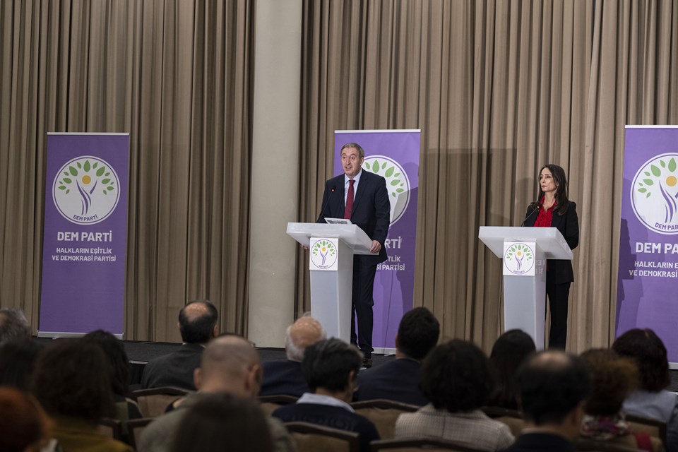DEM Parti Eş Genel Başkanları Tuncer Bakırhan ve Tülay Hatimoğulları, bir otelde düzenledikleri basın toplantısında, terör örgütü PKK'nın Türkiye'den çekilme kararını ve sürecini değerlendirdi.