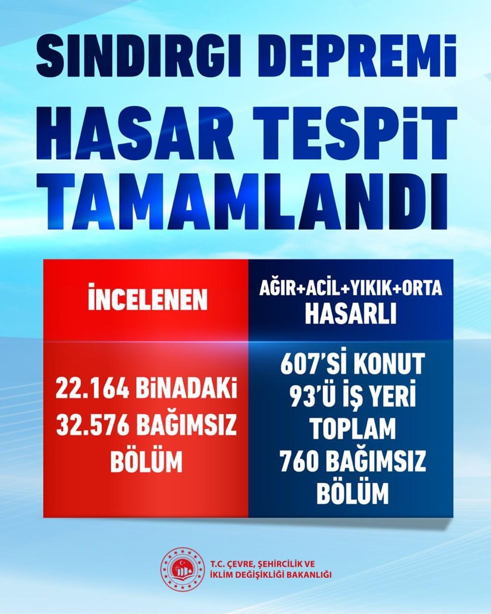 Çevre, Şehircilik ve İklim Değişikliği Bakanı Murat Kurum, Balıkesir'in Sındırgı ilçesinde 27 Ekim tarihinde meydana gelen 6,1 büyüklüğündeki depremin ardından gerçekleştirilen hasar tespit çalışmalarının tamamlandığını duyurdu.