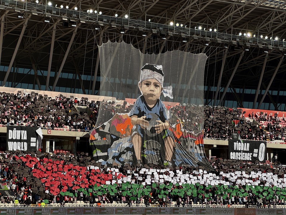 4 Eylül Stadyumu'nda gerçekleştirilen bu etkinlikte, sivasspor taraftarları, Gazze'de devam eden insanlık dramına dikkat çekmek amacıyla anlamlı bir koreografi hazırladı.