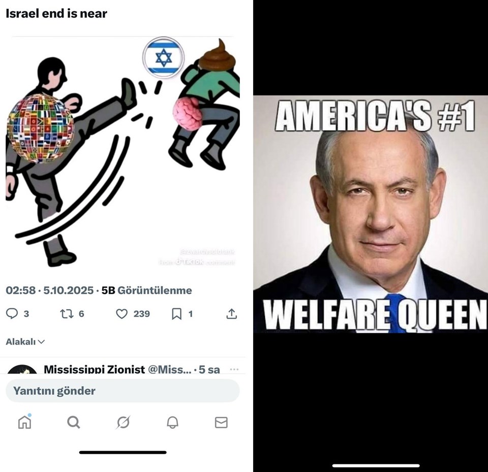 Amerikalı sosyal medya kullanıcıları, İsrail trollerine ağır yanıtlar verdi. Paylaşımlarda, dünyanın İsrail’e olan tepkisini gösteren karikatürler paylaşıldı. Bir paylaşımda, Netanyahu için, Amerikan sosyal yardımlarını kötüye kullananlar için kullanılan "Refah Kraliçesi" ifadesi kullanıldı.