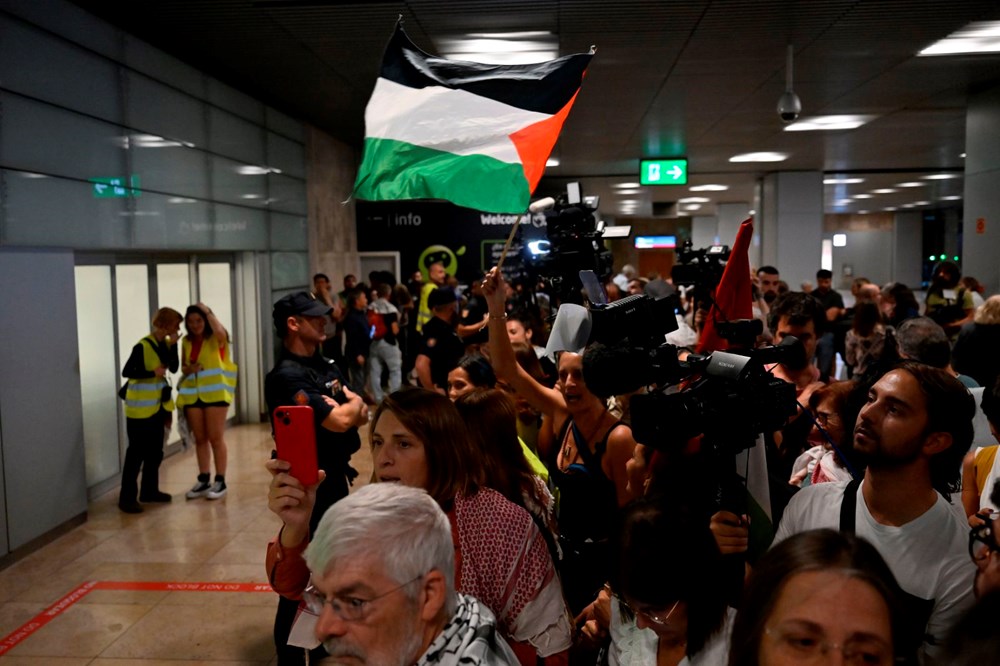 Terminalde "Özgür Filistin", "Katil Netanyahu", "İşgalci İsrail" şeklinde sloganlar atan grup, İspanya'ya dönen aktivistlere sarılarak destek gösterisinde bulundu.