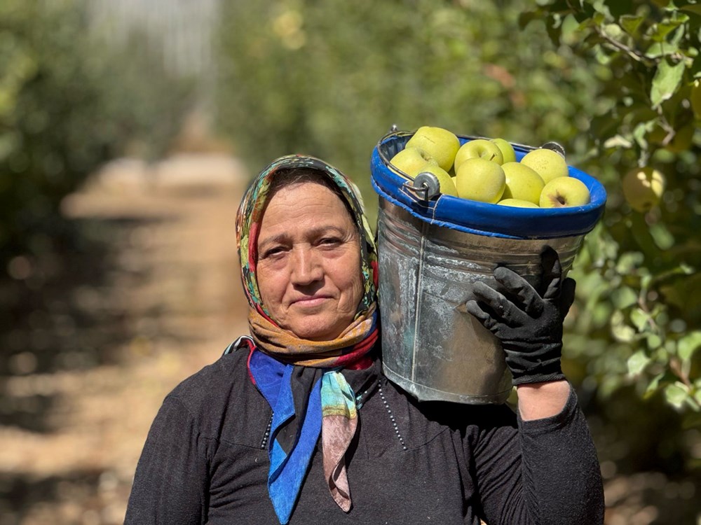 Elma bahçelerinde çalışan Ayşe Karakutu, ilkbaharda budama işlemleri yaptıklarını ve şu günlerde de hasat döneminin başladığını aktardı.