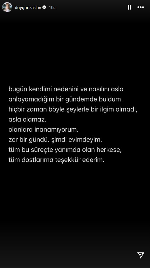 Sosyal medya fenomeni Duygu Özaslan, sosyal medya hesabından yaptığı açıklamada, "Bugün kendimi nedenini anlamadığım bir gündemde buldum." diyerek, "Böyle şeylerle hiçbir ilgim olmadı, asla olamaz." dedi.