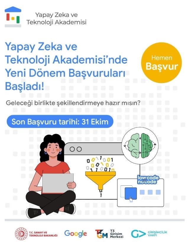 T.C. Sanayi ve Teknoloji Bakanlığı'nın, Google, T3 Girişim Merkezi ve Girişimcilik Vakfı iş birliğiyle hayata geçirilen Yapay Zeka ve Teknoloji Akademisi için yeni dönem başvuruları açıldı.